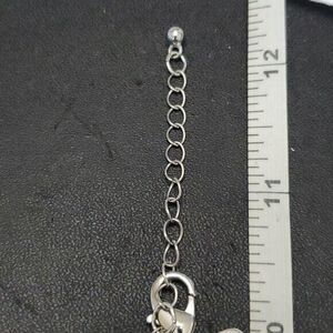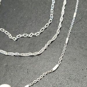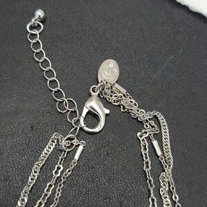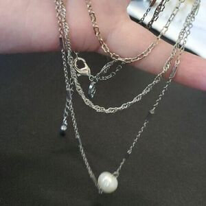 Gorgeous necklace has three layers of silver colored chain. The longest layer has a pretty freshwater pearl.