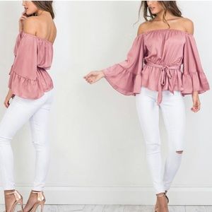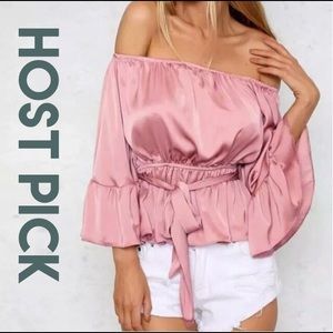 Host Pick✨✨off shoulder, flare sleeves, and a satin finished look. Top comes with a belt that can be used as a choker.