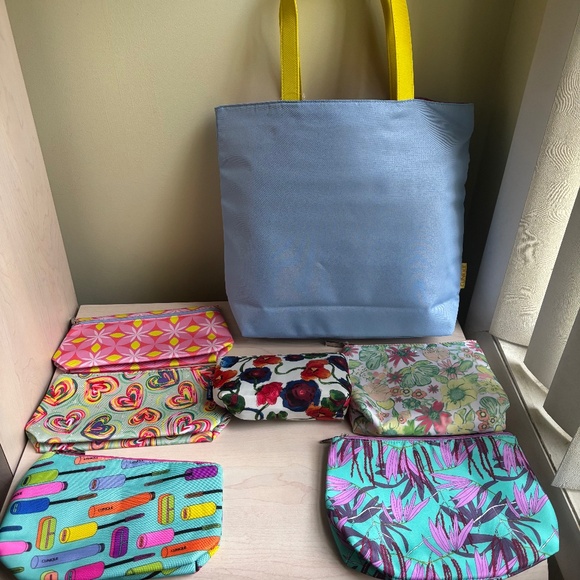 Stunning New Clinique 7 Piece Bundle Periwinkle Blue Tote & 6 Clinique Cosmetic Bag Set. This beautiful set is beautiful to give as holiday gifts or enjoy all of these treasures for yourself. This gorgeous bundle includes a Clinique periwinkle blue tote bag with yellow handles and an interior pattern lining. Also included in this bundle are six additional Clinique makeup bags, one of the bags in which matches the tote. These lovely cosmetics bag can be stored in your handbag for your everyday needs or used for travel. You can also divide the makeup bags as gifts for the holidays as well. This fashionable set will compliment your wardrobe and everyday style.