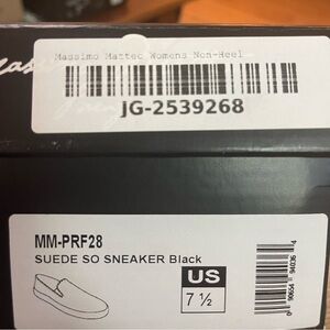 New Massimo Matteo black suede sneakers I called so. Size 7.5 medium made in Brazil very comfortable and real Suede uppers retail $99. They seem to run slightly large so should fit a size 8M.as well.