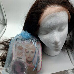 New Princess Hair medium length black hair wig with wig cap and eyelashes. Made in China of high quality, unprocessed human hair. Comes in pictured bag.