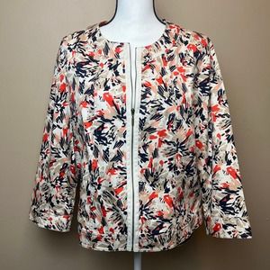 This beautiful lightweight jacket features a stunning burnout hydrangea pattern in red, black, and beige, with a convenient zip front closure and elegant 3/4 length sleeves. Gently worn and in excellent condition, from a smoke-free and pet-free home.