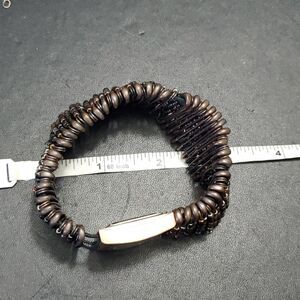 Pretty bronze colored stretch watch has bronze colored safety pins with bronze, black and silver seed beads.
