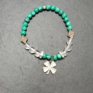 Pretty stretch bracelet has a four leaf clover charm, green beads and clear gemstone beads. It is accented with clear rhinestones. See photos for condition.
