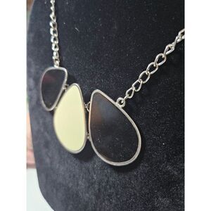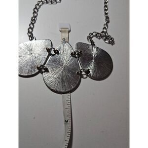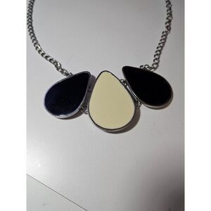 Pretty statement necklace is silver colored with black and white accents. Measures approximately 18 to 20 inches.