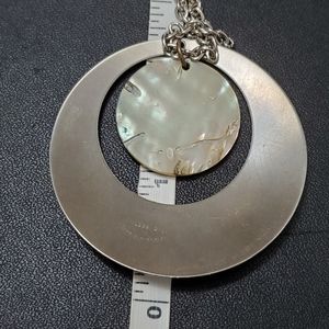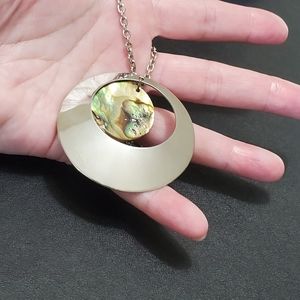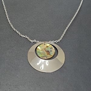 Pretty silver colored necklace has a open circle pendant with an inner circle of colorful abalone.
