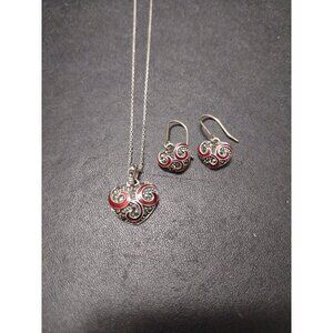 Pretty matching necklace and earring set is sterling silver hearts with red enamel and marcasite accents. Marked SU 925 Thailand.