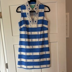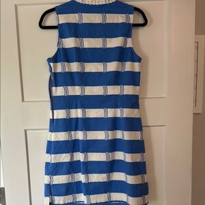 Stylish sleeveless dress with bold blue and white stripes. Features a unique collar design.
