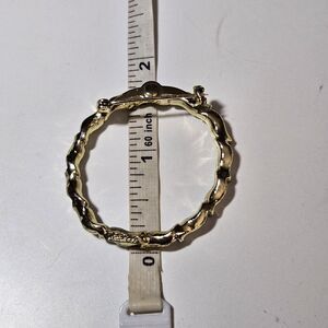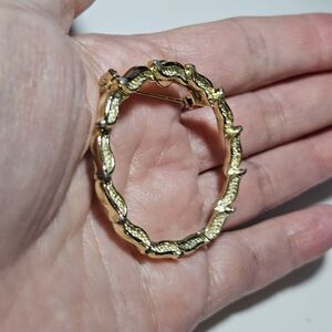 Elevate your attire with this vintage Gerry's leaf circle pin brooch, a timeless piece that exudes elegance. The design features a textured wreath of leaves that gracefully frames any outfit, making it a versatile accessory for both casual and formal occasions. Crafted from gold-toned base metal, this brooch gives a warm, classic touch to your ensemble.