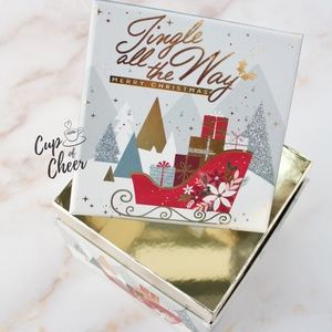 A beautiful decorative Christmas gift box that features a sleigh full of presents and the words "Jingle All the Way" and "Merry Christmas" boxes. The inside is a beautiful gold foil. Perfect for gifting jewelery and other smaller gifts 🎁