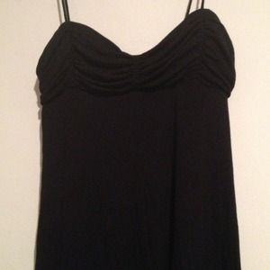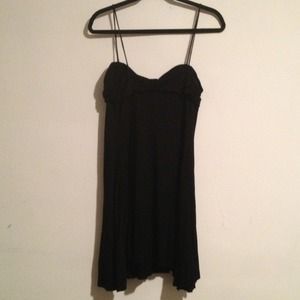 Plain black mini dress with padding in the sweetheart neckline. Spaghetti straps, form fitting and flowy toward the bottom. Asymmetrically longer on sides. Stunning and worn once!