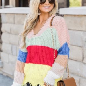This rainbow sweater is oversized and features a fringed hem. Deep V neckline. Factory tattered to give a unique vintage look. Rainbow 🌈 colors! This will quickly become one of your favorite Fall Trends.