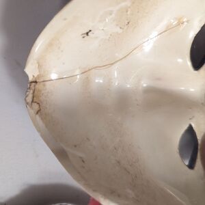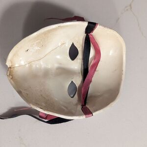 Vintage condition, this piece is very old. Has beautiful details with a clown on the top and flowers with blue eye paint. One of a kind mask. Very flawed. Please see photos for condition.