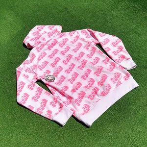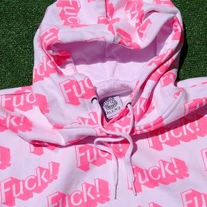 F*ck! pink Barbie font print repeated on the hoodie.