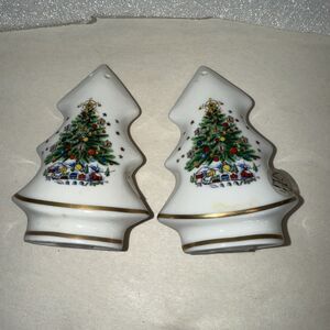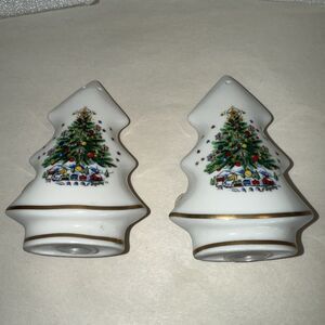 This is a Salem China salt and pepper set featuring a Christmas Tree pattern. Made of porcelain in Japan , it is designed for Christmas occasions. The set is multicolored, adding a festive touch to your table setting during the holiday season.