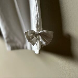 These are white pants that end just below the knee. For a little reference I’m 4’10 (Very tiny haha!). Each leg has a small bow detail at the hem creating a soft vintage feel. I bought these but never worn so they’re NWOT.