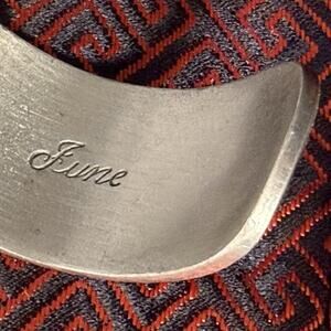 The Salisbury Pewter June Rose Flower Cuff Bangle Bracelet is a stunning piece of vintage and antique jewelry that makes for a beautiful gift for various occasions such as Mother's Day, graduation, Christmas, wedding anniversaries, birthdays, weddings, and religious milestones like Confirmation or Communion. This adjustable cuff bracelet is crafted from silver tone pewter, featuring a delicate rose flower design that is etched and engraved with intricate details. Signed by the brand Salisbury Pewter, this collectible piece exudes beauty, artistry, and a touch of love and romance, making it a perfect gift for someone special. Made in the United States, this bracelet is a timeless and elegant addition to any jewelry collection. Collect all 12 month flower cuff bracelets and wear them each throughout the year.