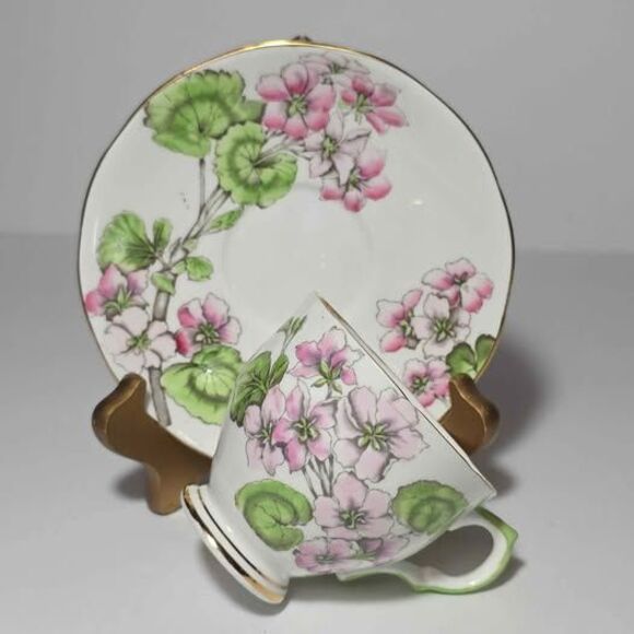 Salisbury Teacup and Saucer Pink Geraniums Vintage