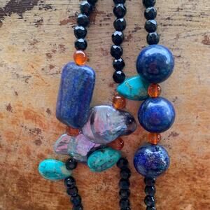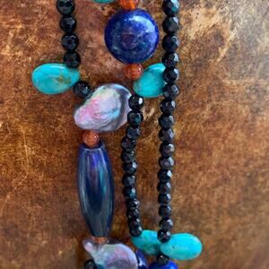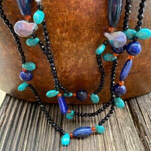Gorgeous combination of colors and shapes in this long multi strand multi stone necklace by Sally C. Stones include onyx, turquoise, carnelian agate, pearl and lapis. Shapes include round, square, rectangular and more. Necklace background stone is onyx. Necklace measures 30 inches long. Marked good condition due to being vintage, no seen damage. Marked SX and 925.