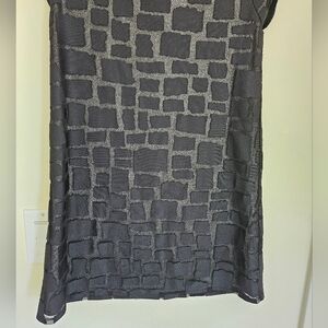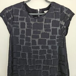 Short sleeve lined dress. Exposed pull tab zipper back.