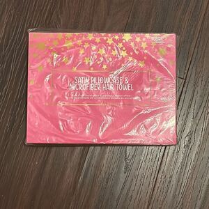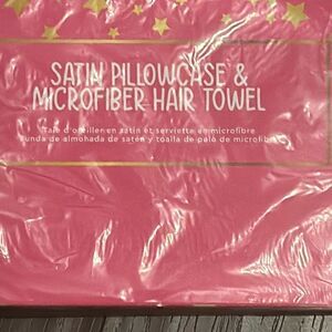 Pink satin pillowcase (20”x 30”) prevents tangles & breakage, star-print microfiber towel reduces frizz, new in box, sealed in plastic