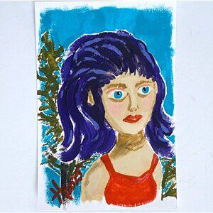 ‘Sally's Gaze" is an original fun impressionist acrylic portrait painting by Artist Tristina Dietz Elmes. Sally's hair is deep purple, but may appear dark blue on computer monitors.