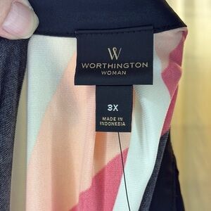 This relaxed-fit blouse showcases a vibrant graphic design in salmon and peach hues, complemented by a stylish mandarin collar. The tunic-style top offers a comfortable and chic look, perfect for casual outings. 34” long. Very small tear in top of right sleeve, easily stitch able. Tear is on the seam. NWT. Pet friendly home.