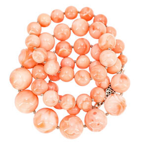 Hand-knotted strung from unworn old-stock Momo coral beads, this necklace displays a lively peach-pink hue with smooth luster and even graduation from 5 to 12 mm.