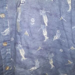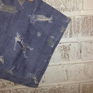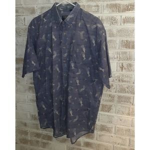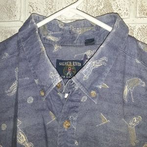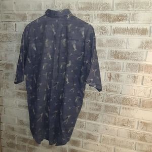 Salmon River Traders Golf Graphic Shirt in Muted Violet Blue & Off White.Short sleeve, collared, button up, & 2 breast pockets. Approximately: under arms-48" length- 30"