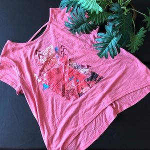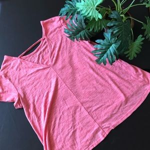 Salmon colored flowy shirt with a triangle cutout in the back. Very cute, lightly used.