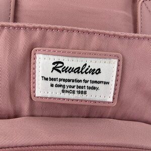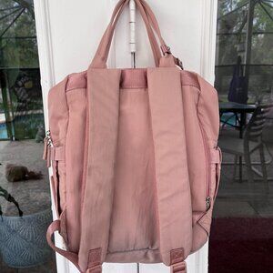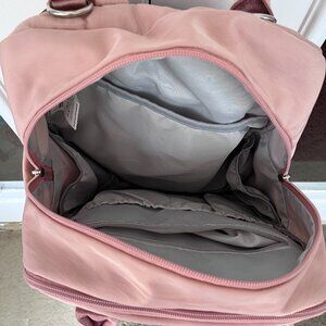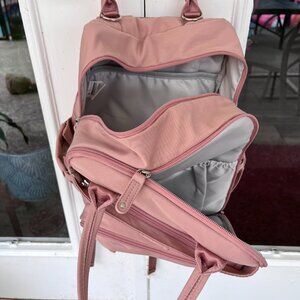 Large salmon colored Ruvalino backpack. Marketed as a diaper bag, but also makes a great travel bag! Perfect carry on size with lots of pockets and room for all your valuables. Some minor staining and smudges, but otherwise in great condition with lots of life left!