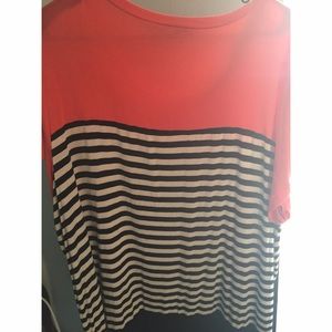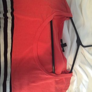 Super light weight and breathable fabric! It's a bright salmon on top and stripes on the bottom! Super cute I just never wear it.