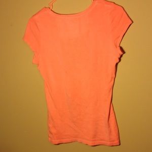 Just a plain cotton shirt, 3 black tiny spits that I can't get out but are unnoticeable and don't even show up on camera. Great staple piece!