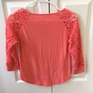 Tags: baseball tee raglan 3/4 length sleeve sleeves sleeved three quarter laced lace pink orange blouse shirt salmon coral girls girl’s girl kids kid kid’s child size large 14