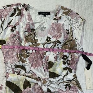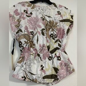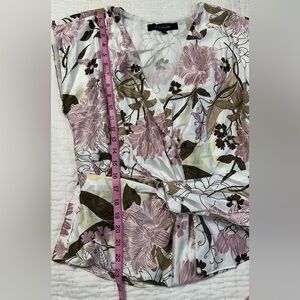 This elegant pink blouse features a wrap design with a tie front and a notched collar, offering a sophisticated look. The light, silky fabric drapes beautifully, making it perfect for both casual and formal occasions. Its artistic floral print adds a touch of romance and charm to your ensemble.