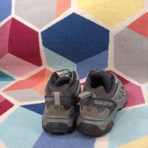 The sneaker features a gray color with black, magnetic, and alloy accents. It has a size of 11.5 US, 7.5 UK, and 46 EU. The inner sole length is 260 mm, and the shoe is part of the Salomon Aero product line. The model is called Salomon Evasion and is suitable for athletic activities.
