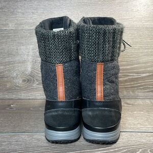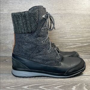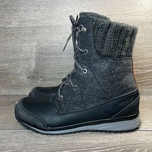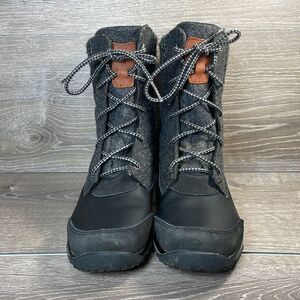 Salomon Hime Mid Waterproof Women’s Sz 8.5 Dark Gray Black Leather Felt Wool Lace Up Winter Snow Boots in good condition. Beautiful waterproof, warm winter boots with winter contra grip tread. Get these boots today, ladies.