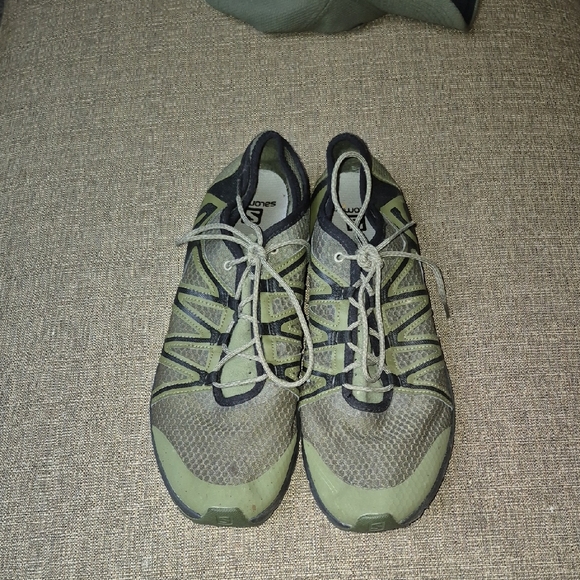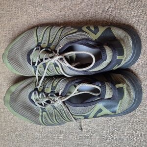 Salomon athletic shoes with olive and black design. Perfect for running and outdoor activities. Offers great support and comfort.