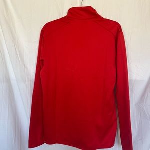 Vibrant red jacket. Full zip front. Chest pocket with zipper. Lightweight and breathable.