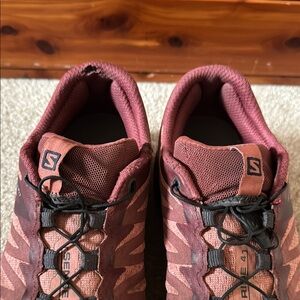 Experience the perfect blend of comfort and performance with Salomon women's trail running shoes. These burgundy shoes are designed for durability and style on any terrain.