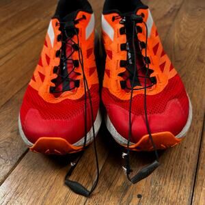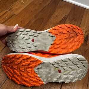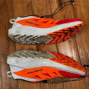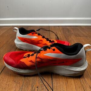 Salomon Sense Ride 5 running shoes, designed for men who enjoy athletic activities such as riding. These sneakers come in an eye-catching orange, red, and gray color combination and are available in a US shoe size of 13 . They belong to the Salomon S product line and are made by the well-known brand Salomon. Excellent Condition In addition to their stylish appearance, these athletic shoes boast excellent performance and activity capabilities. They are a great choice for anyone seeking comfortable and durable footwear for their physical activities. Don't miss out on the chance to own a pair of these top-quality Salomon Sense Ride 5 running shoes.