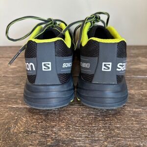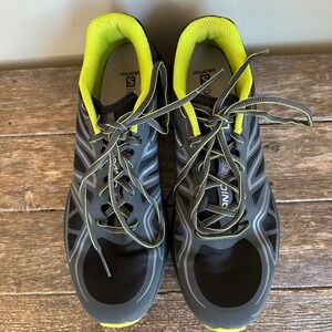 Keywords: Salomon, Sonic Aero, Running Shoes, Men's Shoes, Sneakers, Athletic Shoes, Training Shoes, Trail Running, Comfortable Shoes, Lightweight Shoes, Size 9, Black Shoes, Yellow Accents, Sample Shoes
