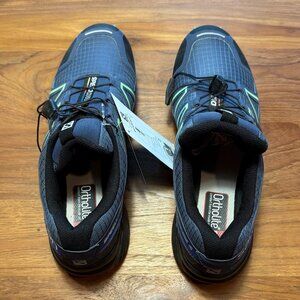 Hi @buffykesha, the last photos are Salomon’s stock photos for the same color as the shoe I am selling. I didn’t get a good photo of the lower part of the shoe but the bottom part of the upper is that teal color. They are not wide. The tag with the sizing is the tag on the shoe I am selling.