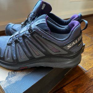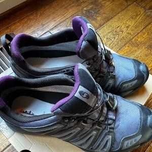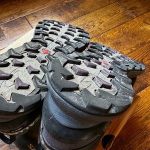 These are in great condition, Salomon XA Comp 6 GTX women's trailing running shoes in size 10! Excellent tread depth and sharpness. The Salomon XA Comp GTX trail-running shows are the top of the line. They're the plum (purple) and grey with black accents. Awesome shoe!