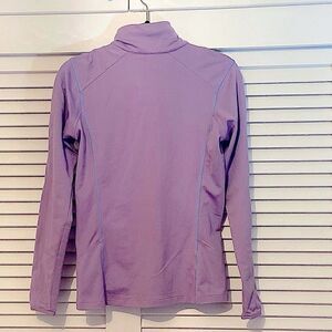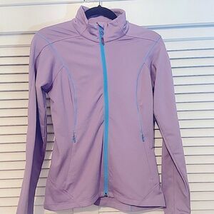 Gorgeous lilac purple with turquoise detail , Salomon Tech fleece/soft shell Acti Therm jacket. Works as a soft shell on days that are not extremely windy (it is not meant to be wind proof but the finish does work that way). Works really well for active outdoor activities and as a mid layer for the slopes. the fabric is stretchy, extremely comfortable, and has a smooth finish on the outside and a soft fleece on the inside. The textired finish looks very sharp and sets it apart from other Salomon or comparable Patagonia jackets. Two mesh pockets and high collar. Pre-loved, worn only once.