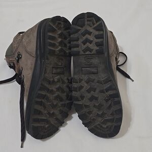 Durable and stylish women's hiking boots in brown and black. Perfect for outdoor adventures. size 6 fits a bit bigger. insoles are missing. otherwise great.