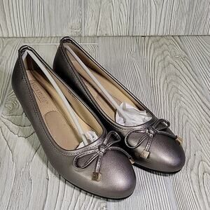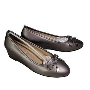 Salon Studio Metallic Pewter Wedge Slip On Bow Toe Shoes Womens 8W NEW