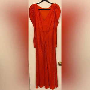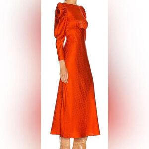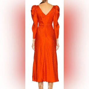 Saloni Alena Ruched Sleeve Silk Floral Jacquard Midi Dress Bitter Orange Size 6. Good pre-owned condition, there are a couple of snags on the inside of the bust area. Cannot be seen when worn. Bust measures 17in. laid flat. Length 55in.
