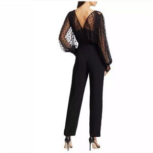 saloni jumpsuit, black jumpsuit, sheer sleeves, polka dot, evening wear, v-neck, women's fashion, elegant outfit, party jumpsuit, designer jumpsuit, polyester blend, stylish clothing, zip closure, swiss dots, fairy grunge, whimsigoth, evening wear, formal wear, elegant, going out, black tie, cocktail, gothic princess