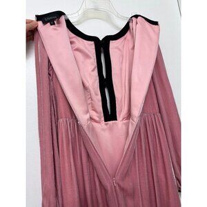 This Saloni Camille Crystal Bow Liquid Velvet Midi Dress is in good condition. Features a luxurious rose pink velvet material with black embellished / beaded bows. Long sleeves, round neckline, cutouts in the front, long midi length. There are some slightly faded areas (mostly only visible under certain lighting). There is wrinkling on the hem. There is slight darkening on the back shoulder and on one side. There are some tiny speck marks on the front chest.
